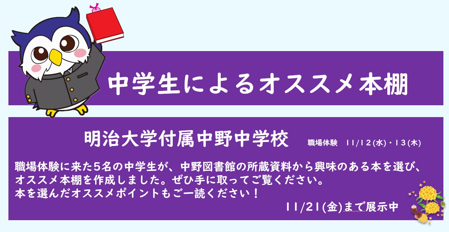 職場体験に来た5名の中学生が、中野図書館の所蔵資料から興味のある本を選び、オススメ本棚を作成しました。ぜひ手に取ってご覧ください。本を選んだオススメ